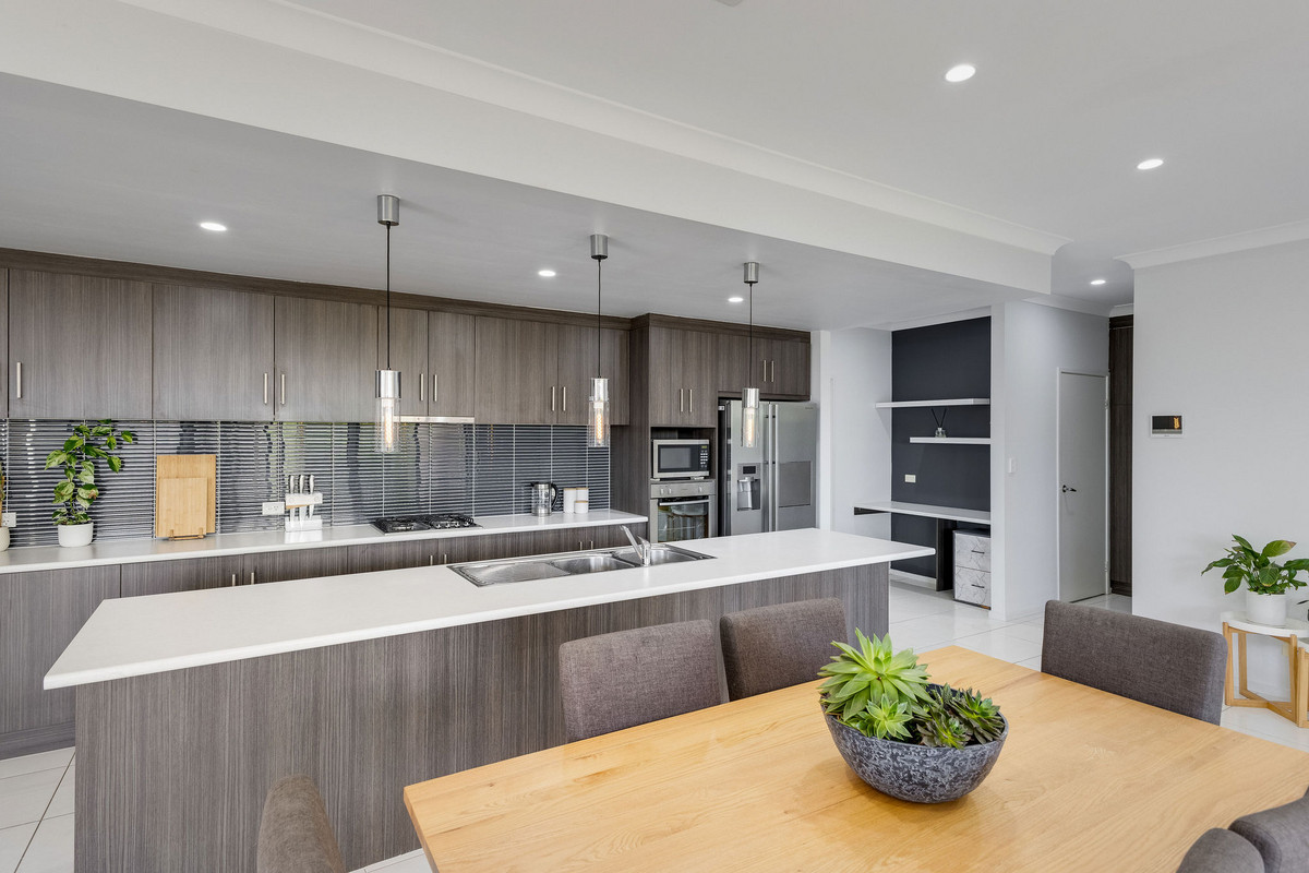 Inside and at its heart, the open-plan kitchen, living, and meals area offers the perfect space for family living and entertaining. The kitchen impresses with sleek cabinetry, a spacious walk-in pantry, a striking tiled backsplash, and stainless steel appliances, including a gas cooktop.