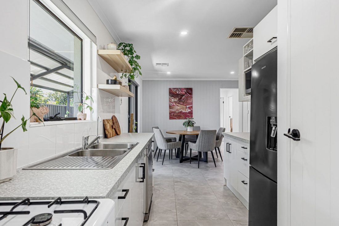 Continue through to the open-plan meals and kitchen area, where the kitchen has been thoughtfully renovated with sleek cabinetry, soft-close drawers, a tiled splashback, a stainless-steel dishwasher, and a standalone gas oven and stove. High quality tiled flooring flows seamlessly throughout, enhancing the home’s contemporary aesthetic and cohesive feel.