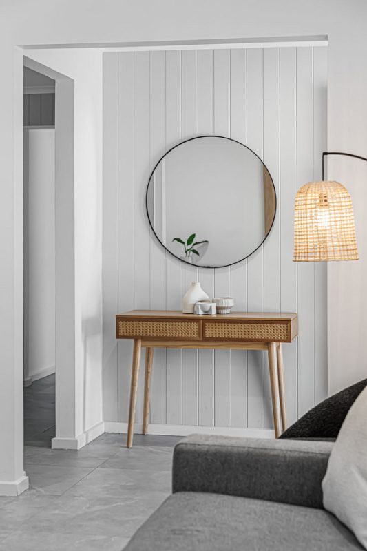 Light-filled front lounge featuring a stylish barn door, panelled feature wall, and abundant natural light