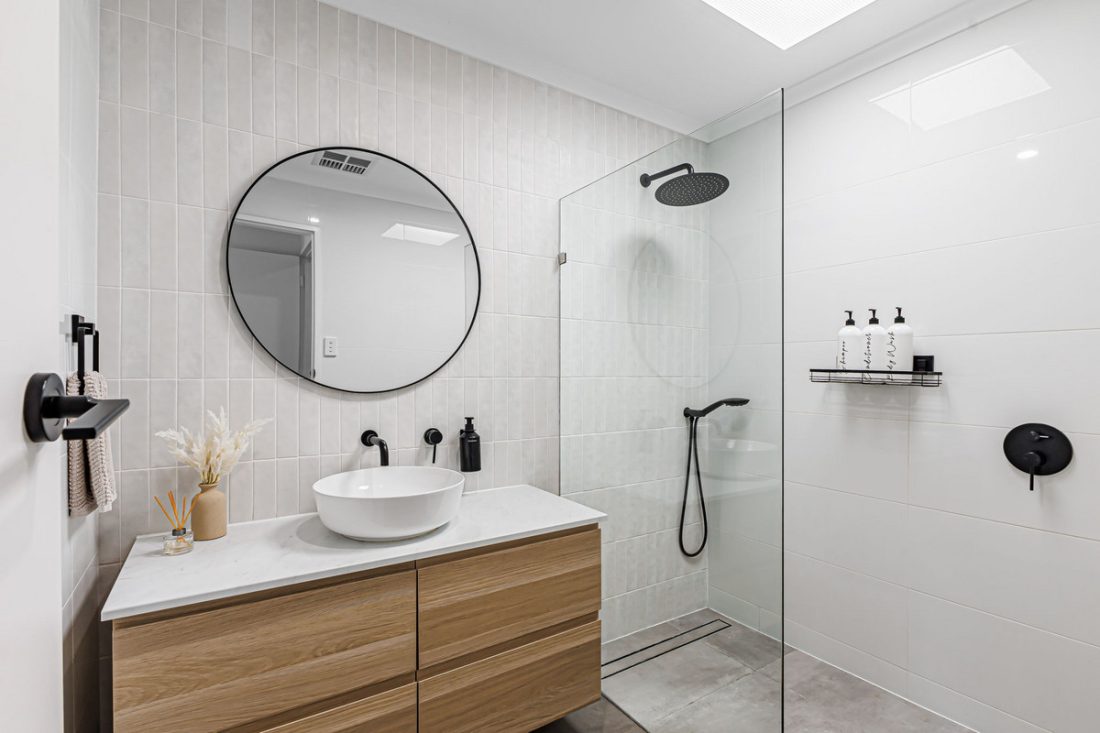 Back inside, three well-sized bedrooms each feature built-in robes for convenient storage. The luxurious bathroom is a true standout, boasting floor-to-ceiling tiles, a frameless walk-in shower, a modern vanity, and matte black fixtures.
