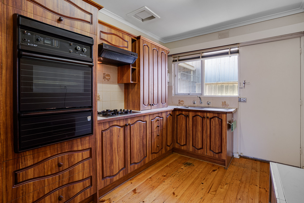 Upon entering, you are welcomed by a large open living area adorned with hardwood timber flooring and a feature mantle piece complemented by a heater. The kitchen is a delightful space equipped with a gas cooktop, electric oven, and ample cabinetry, ensuring a perfect blend of functionality and style.