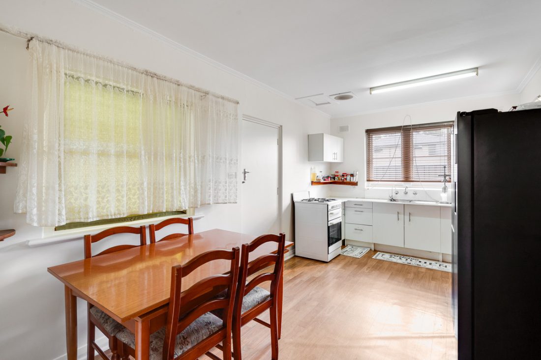 The kitchen offers updated cabinetry, a gas cooktop, and oven within a practical layout that makes daily use a breeze. Three well-sized bedrooms are serviced by a neat bathroom with charming terrazzo flooring, a bathtub, shower, and vanity, while a separate toilet and generous laundry add everyday convenience.
