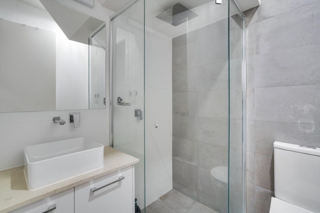 –Luxurious bathrooms with floor-to-ceiling tiling, chrome finishings, and stone benchtops