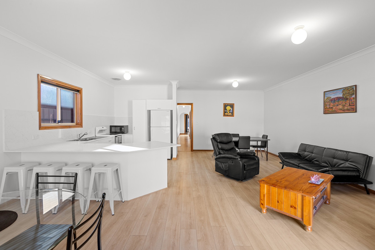 Step inside to discover an open-plan design that seamlessly integrates the kitchen, living, and dining zones. Filled with natural light and complemented by timber-look flooring, this central space is both warm and functional. The modern kitchen is appointed with white benchtops, ample cabinetry, a marble-look splash back, and an induction cooktop—providing the ideal base for culinary creativity.