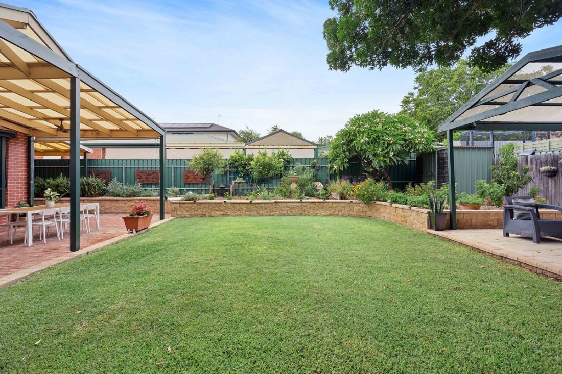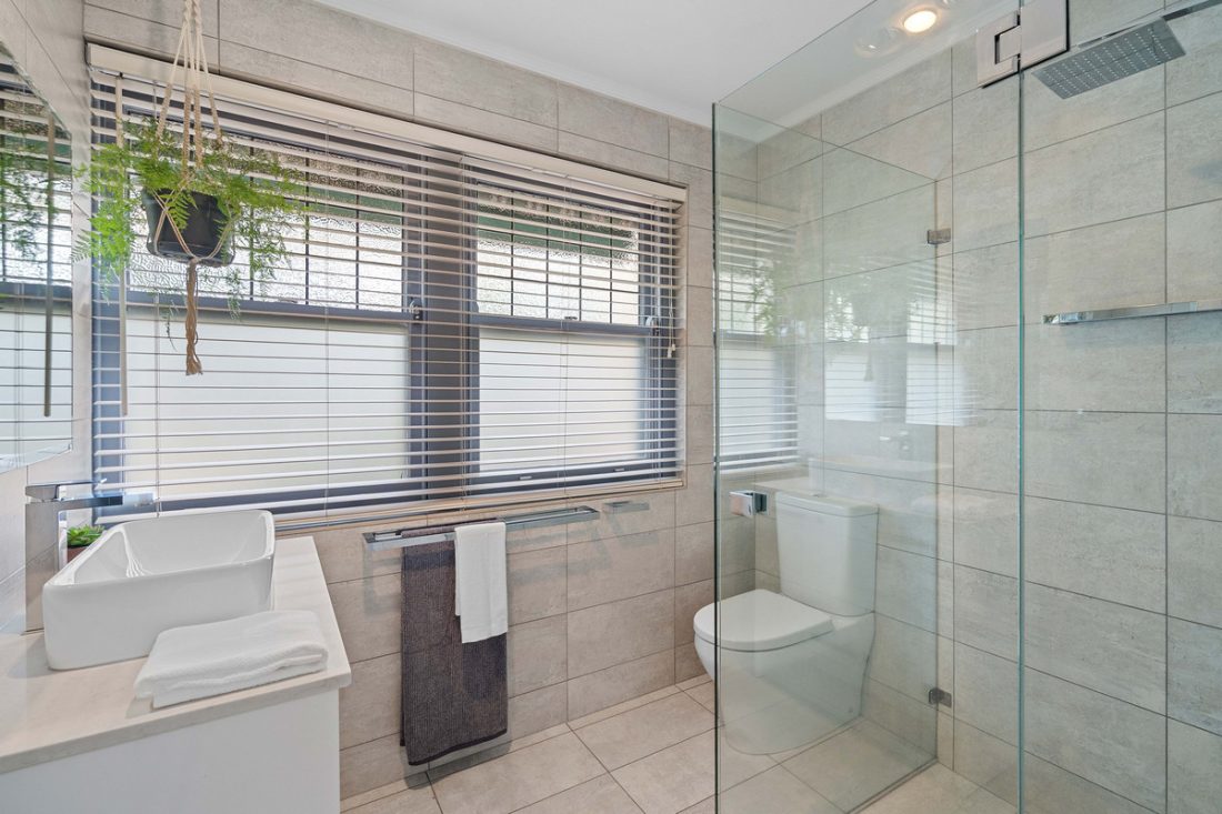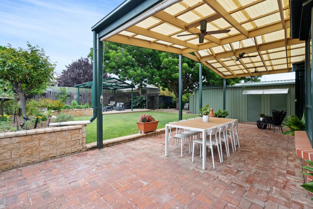 The main bathroom is both stylish and practical, boasting a stunning freestanding bathtub and a separate toilet for added convenience when guests visit. Step outside to discover an expansive backyard, designed for year-round entertaining. A gabled pergola with ceiling fans overlooks lush green lawns, while a secondary pergola provides a tranquil space to unwind. Raised garden beds and established greenery create a serene outdoor oasis.