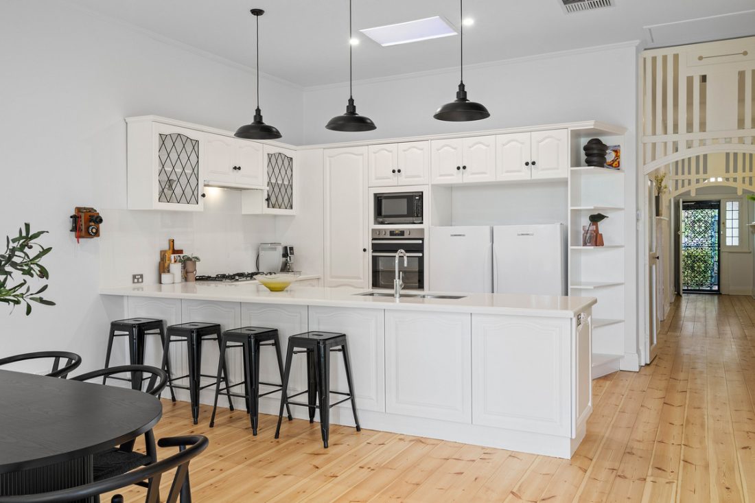 The kitchen radiates country charm with white cabinetry, black handles, stone benchtops, and stainless steel appliances – a delightful setting for culinary creations and casual dining alike.
