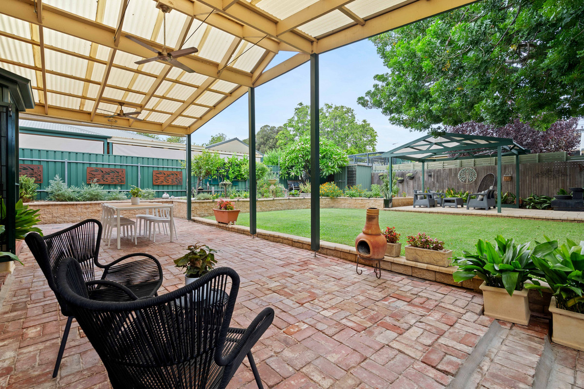 The main bathroom is both stylish and practical, boasting a stunning freestanding bathtub and a separate toilet for added convenience when guests visit. Step outside to discover an expansive backyard, designed for year-round entertaining. A gabled pergola with ceiling fans overlooks lush green lawns, while a secondary pergola provides a tranquil space to unwind. Raised garden beds and established greenery create a serene outdoor oasis.
