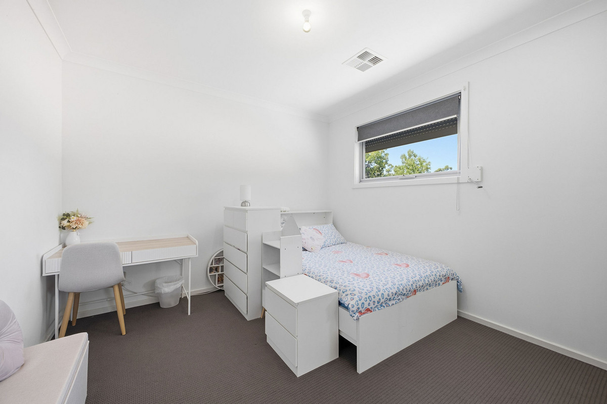 Upstairs, the master bedroom is generously sized and includes a walk-in robe and private ensuite. Two additional bedrooms, both with built-in robes, are serviced by a modern main bathroom with bathtub, shower and vanity, making it a great setup for busy households. All bedrooms are carpeted for comfort, with modern finishes throughout the bathrooms and air conditioning providing year-round comfort.