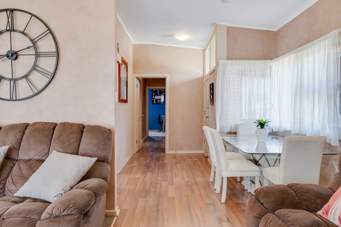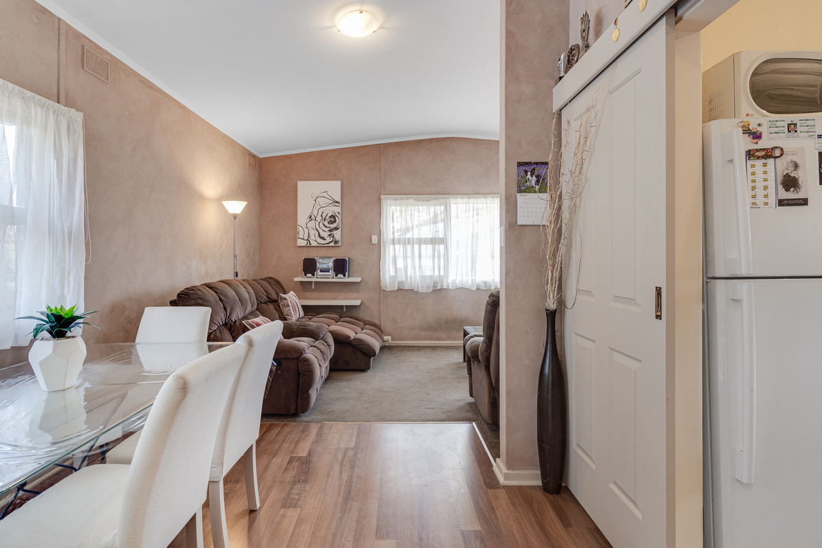 As you step inside, you’ll be welcomed by the spacious front lounge, featuring a vaulted ceiling and bathed in natural light from a large window. The area is kept comfortable throughout the year with a split-system air conditioner and flows seamlessly into a well-sized dining area, perfect for connecting with friends and family during gatherings.