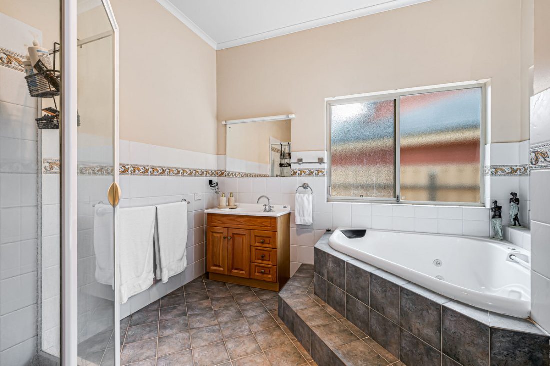 – Main bathroom with corner spa bath with jets, shower, and vanity