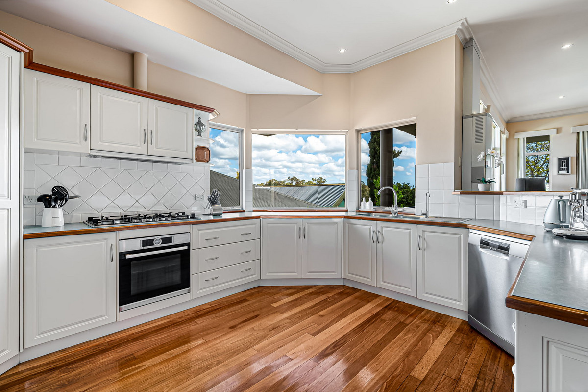 The open-plan kitchen, dining, and lounge area featuring lofty ceilings serves as the true heart of the home, providing a cosy space to unwind while soaking in the stunning views. The kitchen combines stylish country-style cabinetry with practical design, making every meal a breeze. Equipped with a dishwasher, breakfast bar, double stainless-steel sink, gas cooktop, oven, walk-in pantry, and a handy microwave alcove, it’s ready for any occasion.