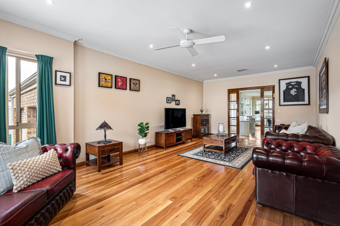 The polished rose gum timber floors flow throughout, adding warmth and elegance to the home welcoming you as soon as you enter. Stepping into the formal lounge you will find a light-filled haven with a ceiling fan to keep the space airy and comfortable. Sliding French doors seamlessly connect the lounge to the open plan living area, creating the perfect space for family gatherings.