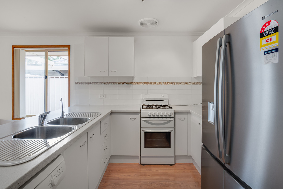 The refreshed kitchen is a chef’s dream, equipped with a gas cooktop, electric oven, tiled splashback, and plenty of cabinetry to store all your culinary essentials. An adjacent family area continues the timber-look flooring and features another gas heater, making it the ideal spot for cozy family movie nights.