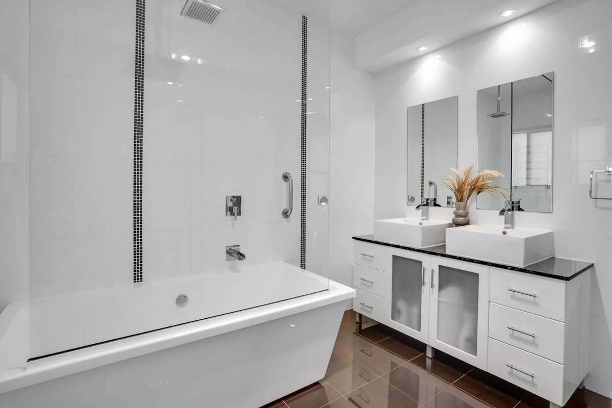 Both bathrooms have been tastefully renovated, featuring sleek floor-to-ceiling tiling and ample storage. The main bathroom enjoys a double sink vanity and luxurious bath for unwinding.