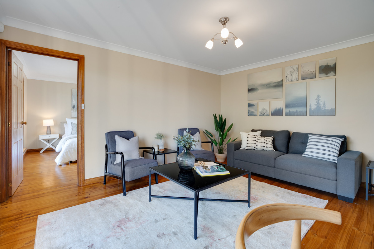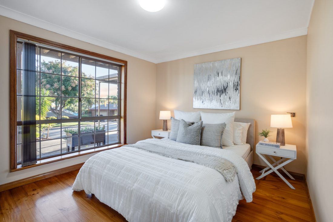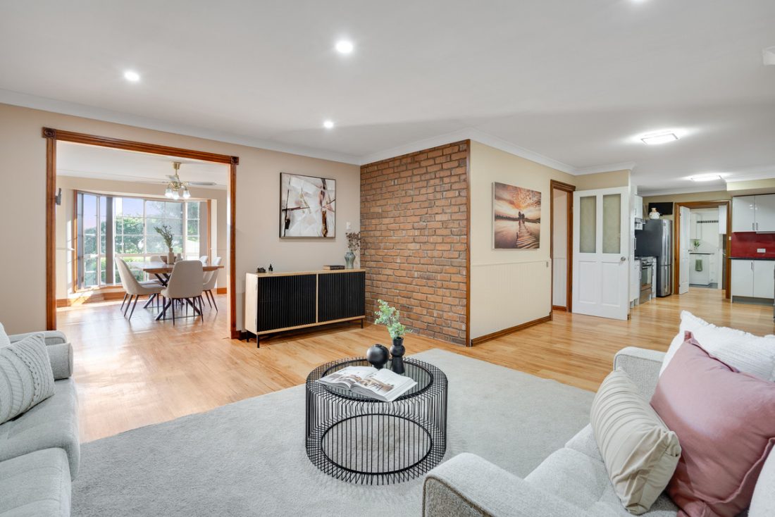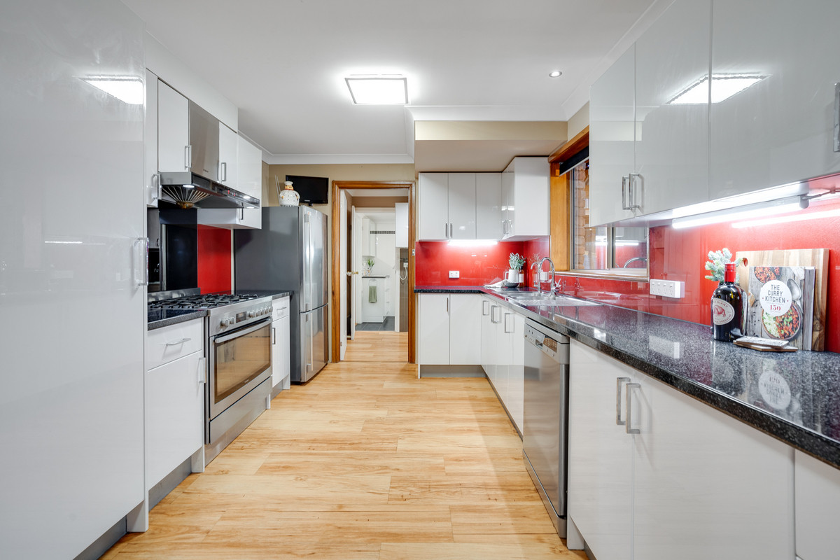 The sleek kitchen exudes style with its modern cabinetry, stone bench-tops, and stainless steel appliances – including a 900mm gas cook-top and new range hood. There’s also plenty of space for an extra dining table, perfect for casual meals.