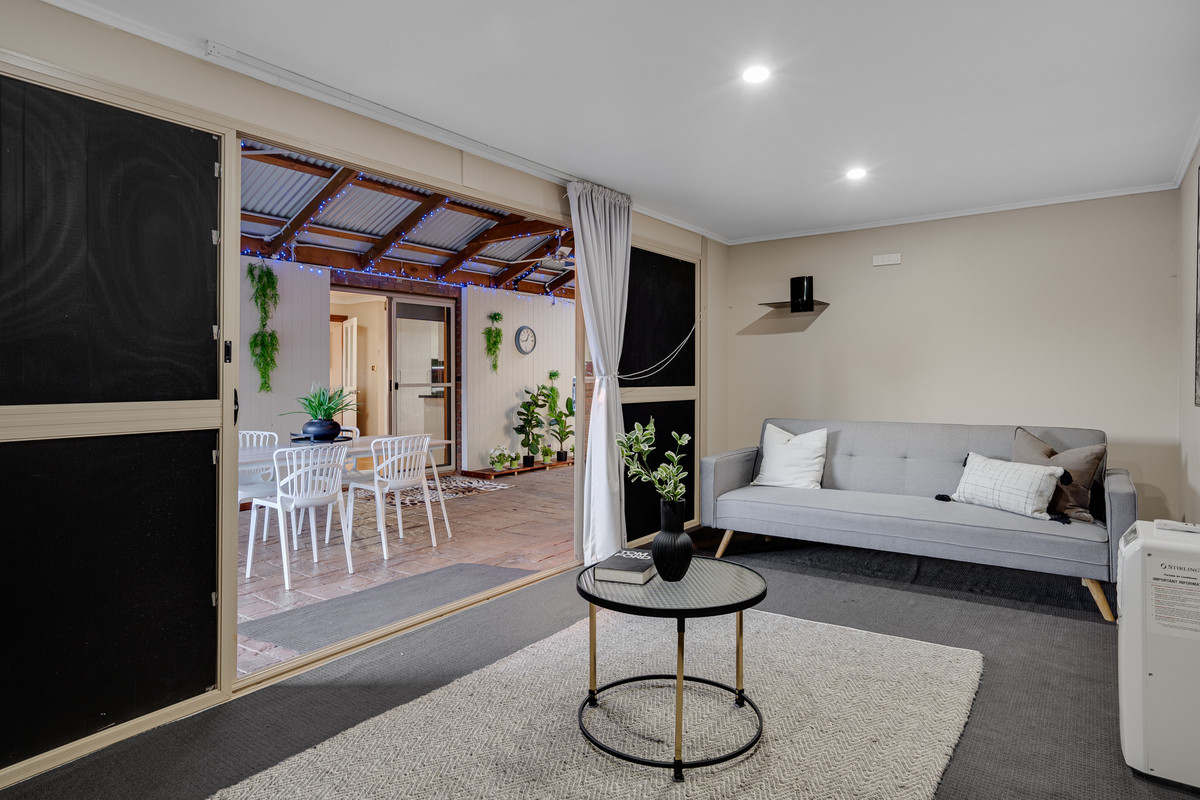 Step outside through the glass sliding doors from the kitchen to unveil an extensive undercover alfresco area—an ideal setting for year-round entertaining. This versatile space can seamlessly transform into another enclosed living area, equipped with ceiling fans and air-conditioning. Connected to this, a newly built detached rumpus room offers limitless possibilities—ideal for a teenager’s retreat, a kids’ play area, a home office, a gym, or even a sixth bedroom.