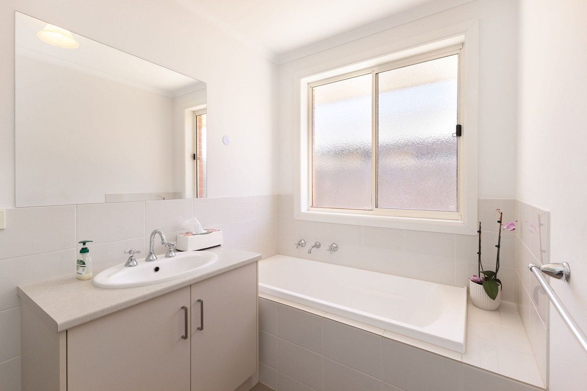 Both the ensuite and main bathroom are bright and modern, showcasing neutral tiles, sleek vanities, and contemporary fixtures. The main bathroom also includes a built-in bath and a separate toilet for added convenience.