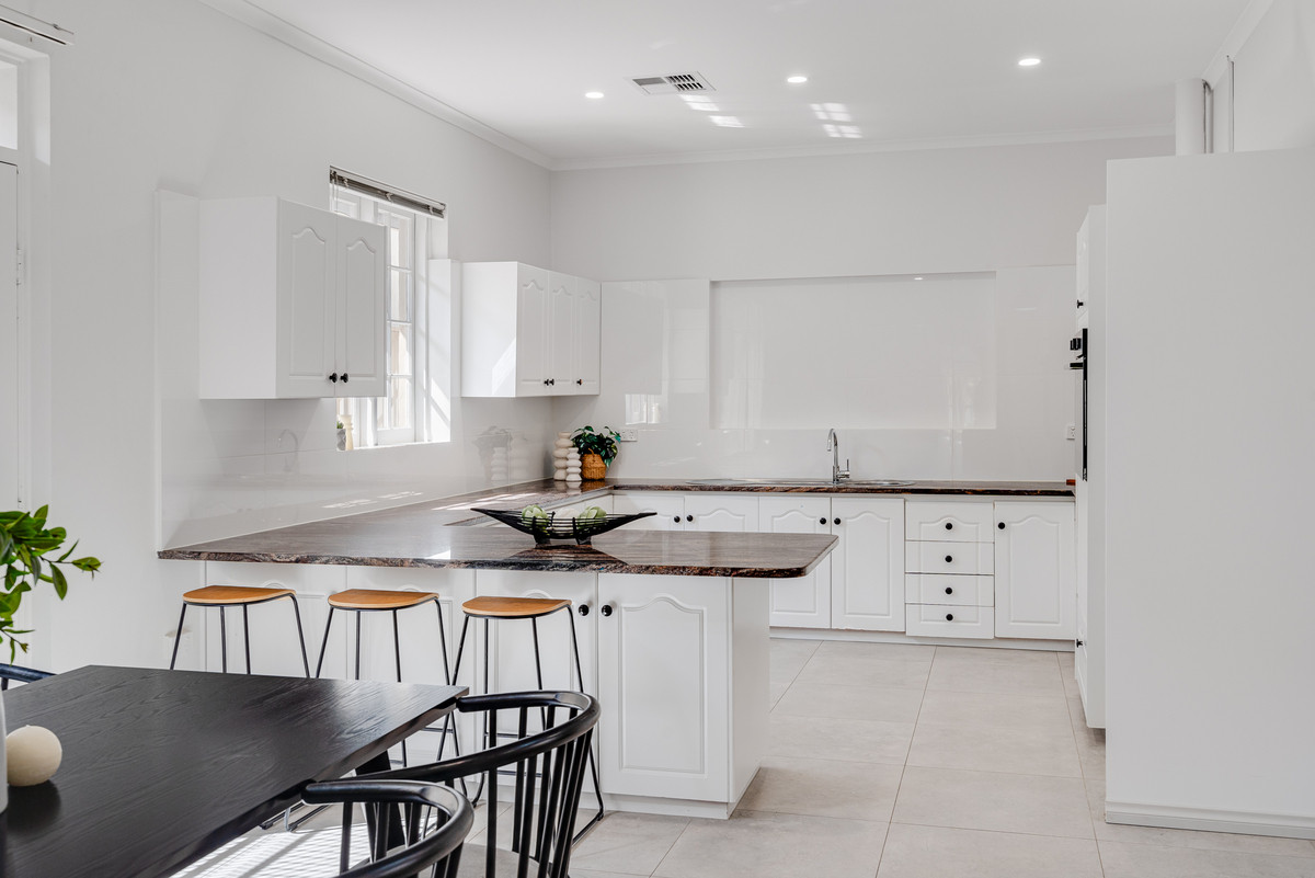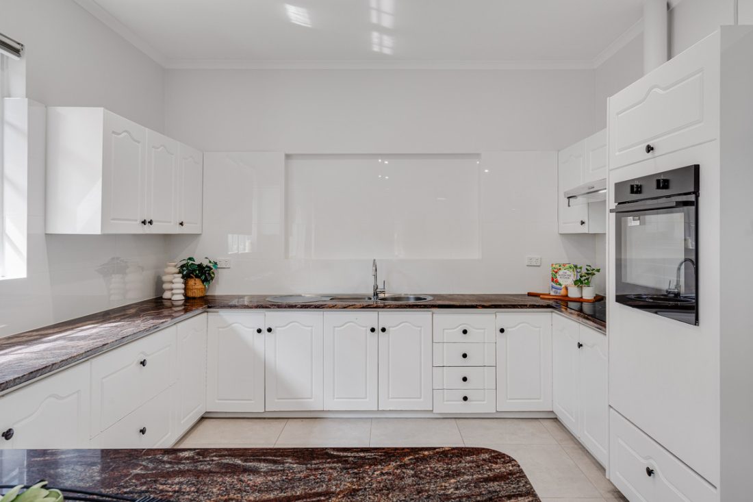 – Spacious kitchen with extended stone benchtop, white-tiled splashback, gas cooktop, and modern cabinetry