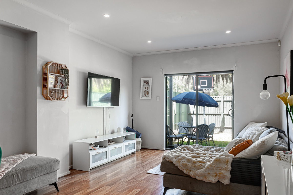 Sliding glass doors open to the backyard, seamlessly blending indoor and outdoor living. A cozy yard with a touch of greenery creates a low-maintenance space, letting you enjoy more time outdoors with minimal upkeep.