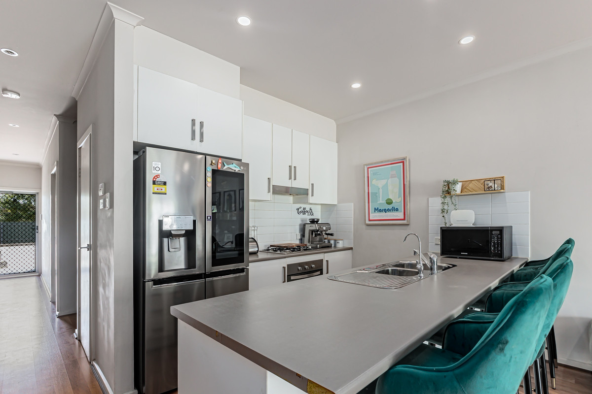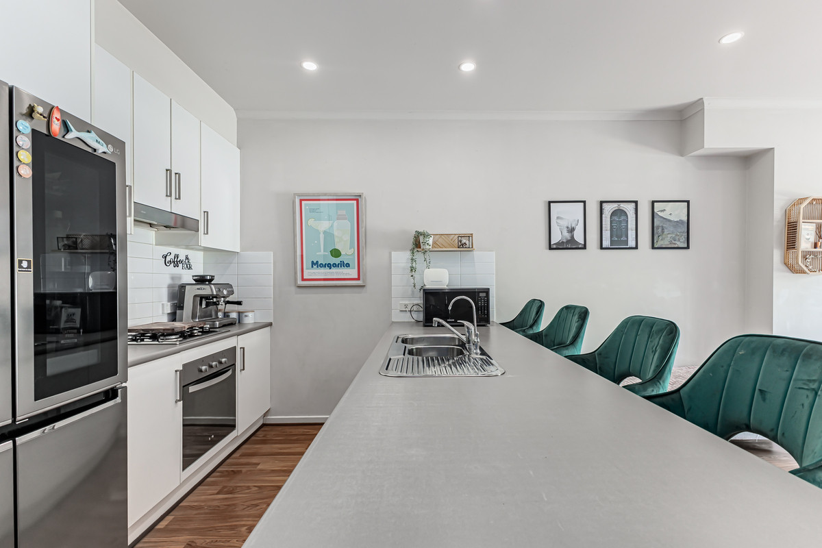 The kitchen exudes style and functionality, with sleek white cabinetry, a tiled backsplash, and modern stainless-steel appliances, including a gas cooktop. The bench-top extends to form a breakfast bar with seating for up to four, perfect for casual meals and conversations.