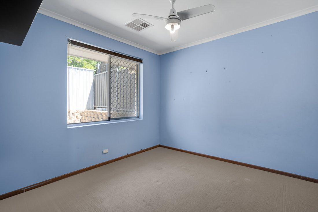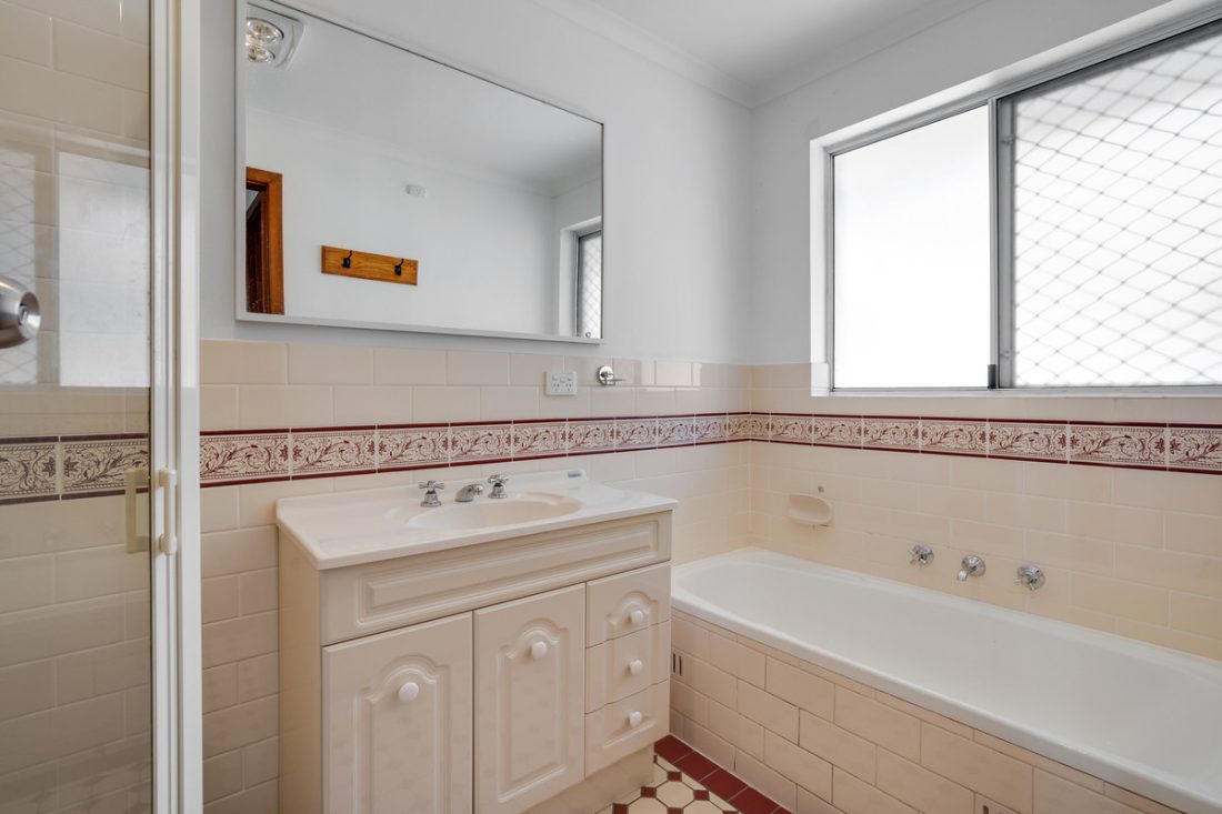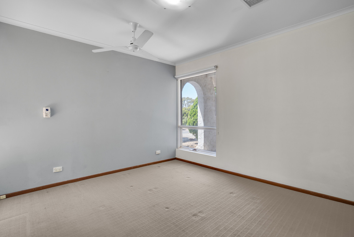 The property features three bedrooms, with the master bedroom offering a large built-in robe, a ceiling fan, and street views, creating a comfortable and serene retreat. Two additional bedrooms feature carpeting, ceiling fans, and wide windows, with one of them including a built-in robe. The shared main bathroom is practical, featuring a large built-in bath and a separate shower for added convenience.