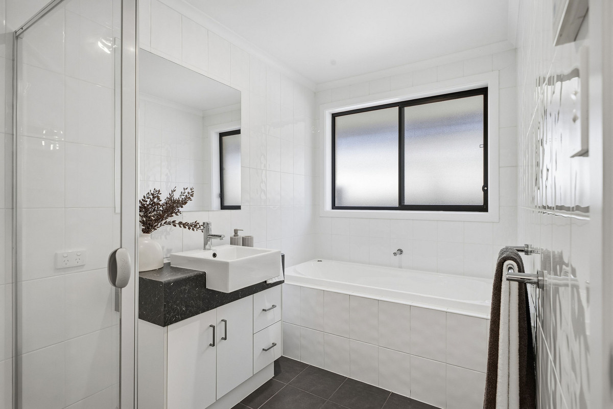 The master suite offers a peaceful retreat, complete with a walk-in robe and private ensuite, while the two additional bedrooms include built-in robes, ceiling fans, and easy access to the stylish main bathroom with full-size shower, bathtub, and vanity. A separate wash closet adds everyday convenience.