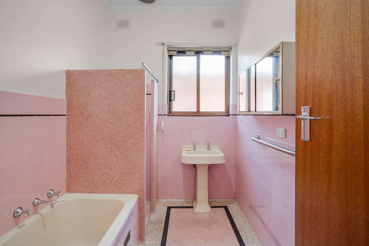 Explore three well sized bedrooms, each positioned to capture natural sunlight. Two of these bedrooms come equipped with ceiling fans, ensuring comfort as the warmer months approach. A charming main bathroom, adorned with pink tiles and terrazzo flooring, adds to the home’s unique character.