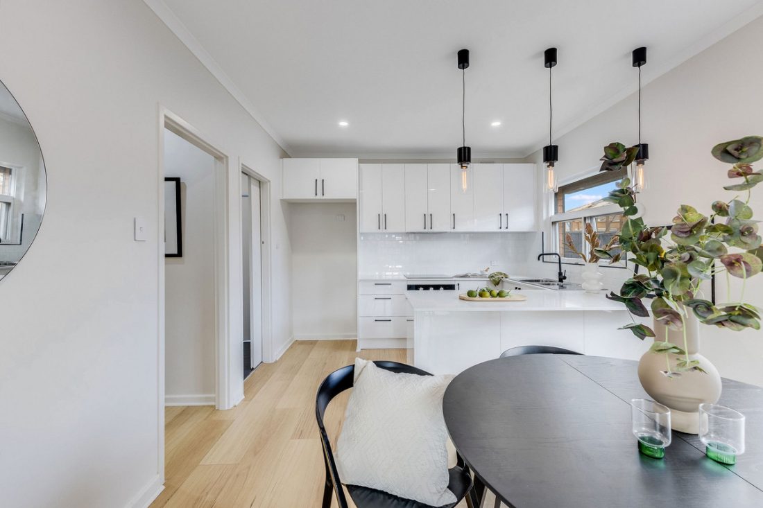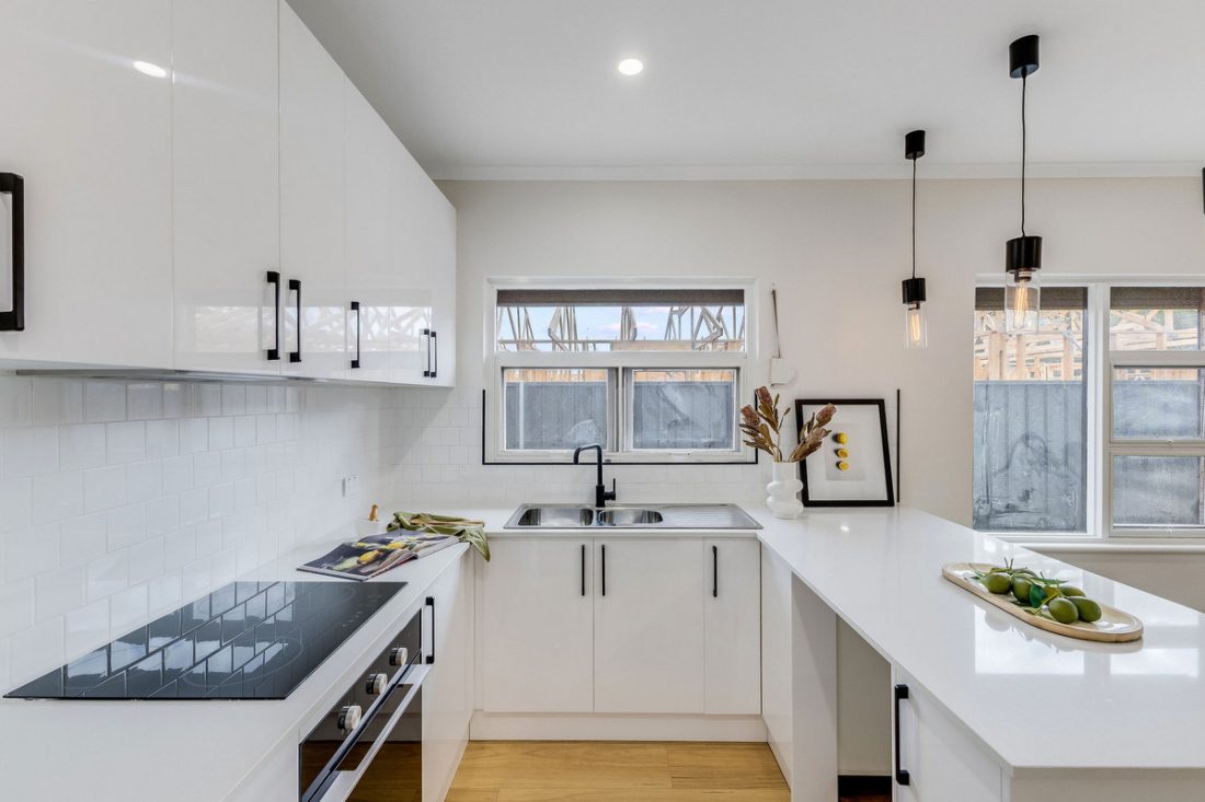 The all-new kitchen is a true centrepiece, showcasing glossy white cabinetry, matte black hardware, feature pendant lighting, a classic subway-tiled splashback, and sleek appliances including an electric cooktop.