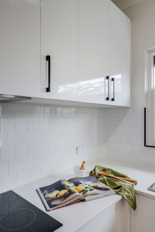 – Sleek new kitchen with electric cooktop, glossy cabinetry, and subway-tiled splashback