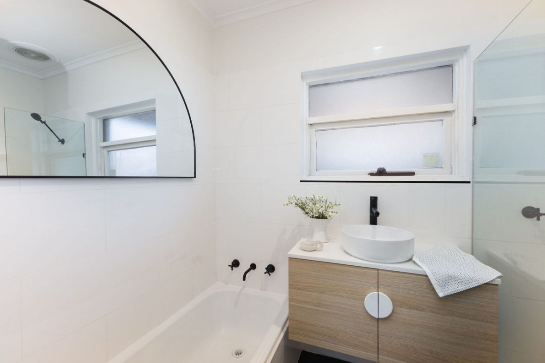 – Brand new bathroom with large white tiling, modern vanity, frameless shower and separate water closet