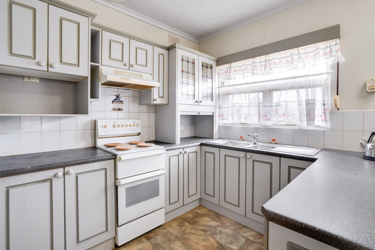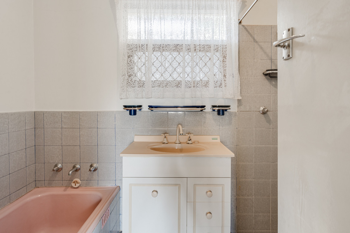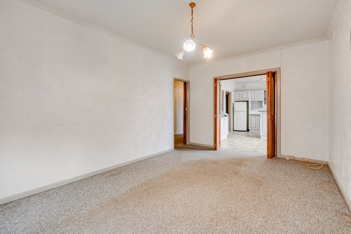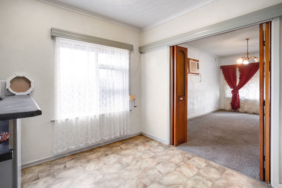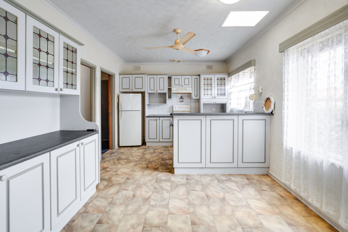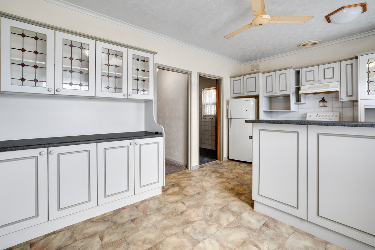 Inside, the bones of this home provide a solid foundation for transformation. The spacious front lounge is filled with natural light, offering a great starting point for a modern makeover. The cozy kitchen/meals area, complete with vintage wooden cabinetry, is brimming with potential to be reimagined, while all three bedrooms are well-proportioned.
