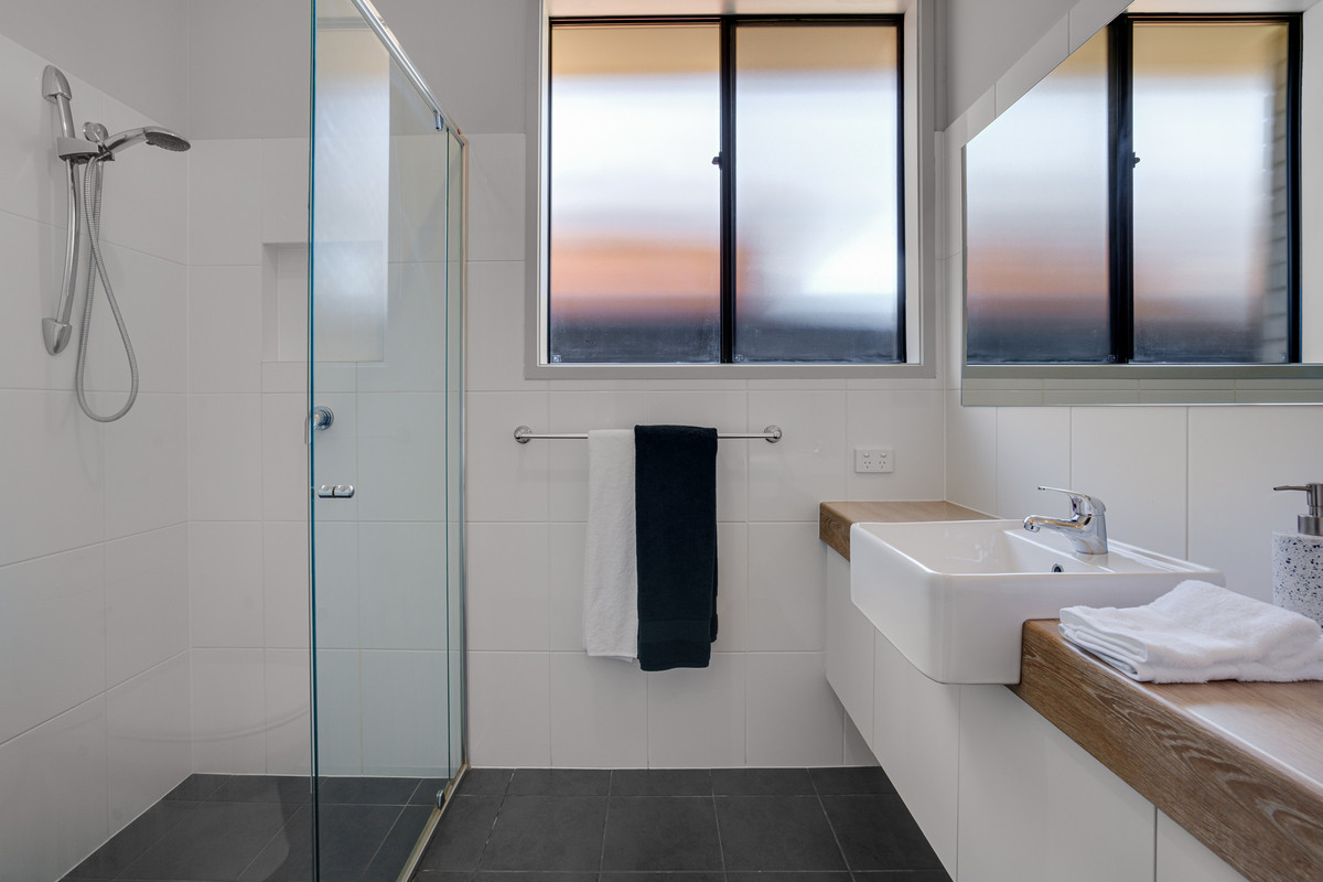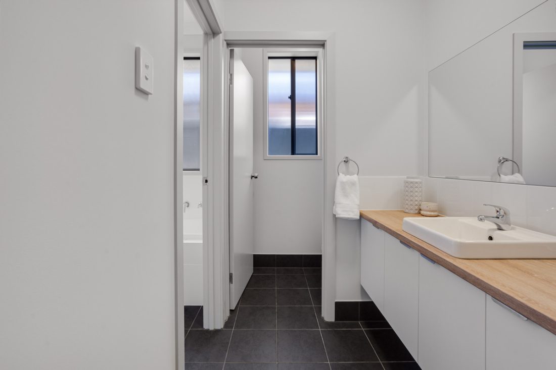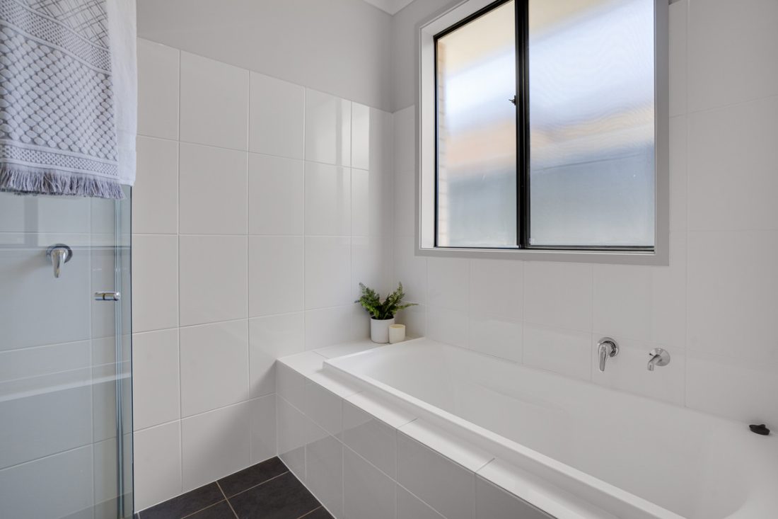 The modern main bathroom boasts white tiling, a spacious built-in bath, and a separate shower, while a separated vanity and WC cater to the privacies of a growing family.