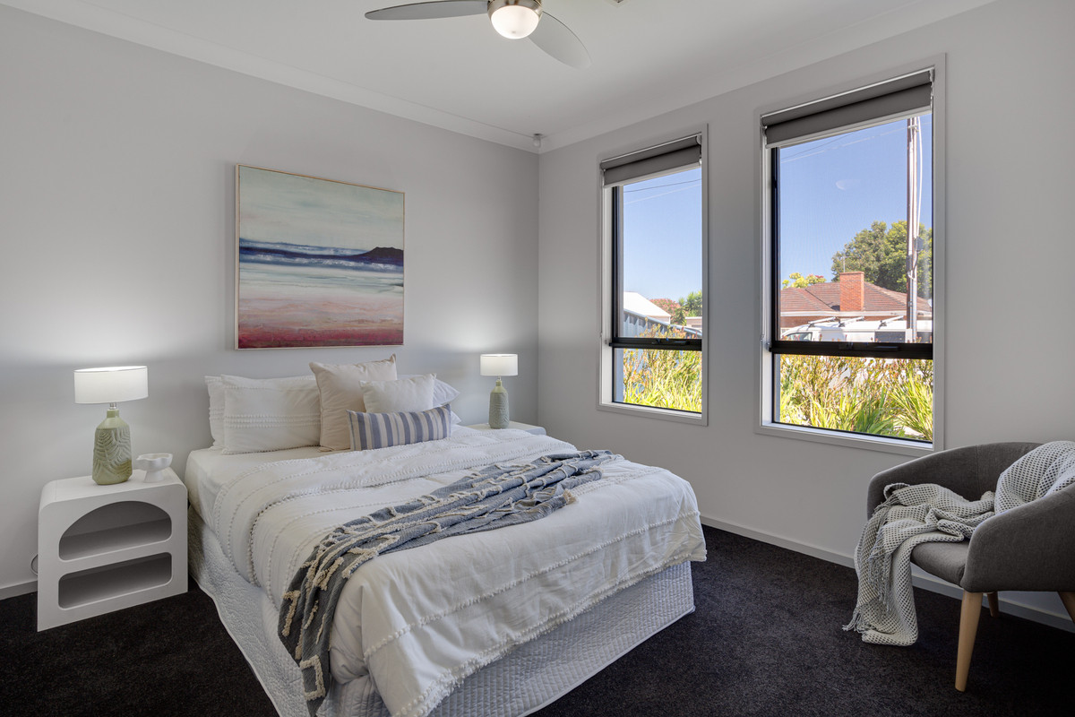 Retreat to the large master suite, complete with a walk-in robe, private ensuite, and views to your new streetscape. Two additional bedrooms are appointed with new plush carpeting, ceiling fans, and built-in robes, providing comfort and convenience for family members or guests.