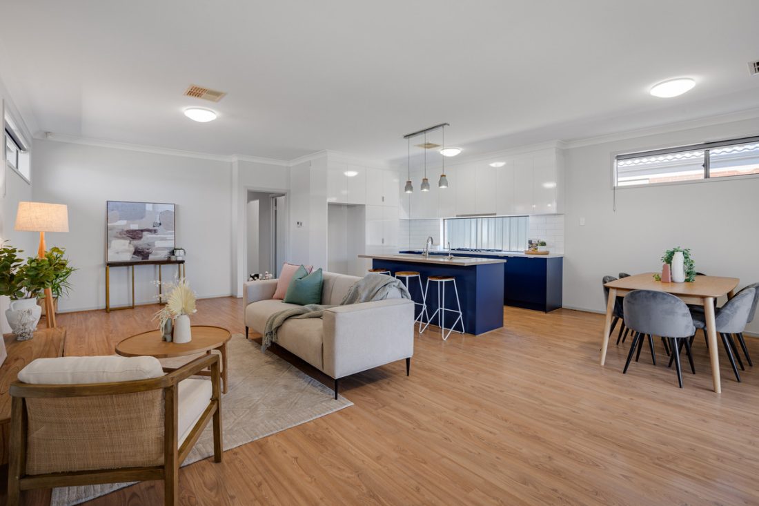 Step inside to discover a white and bright interior adorned with warm timber-look floating floors throughout. The open plan layout seamlessly integrates the kitchen, living, and dining areas towards the back of the home, creating an inviting space bathed in natural light.
