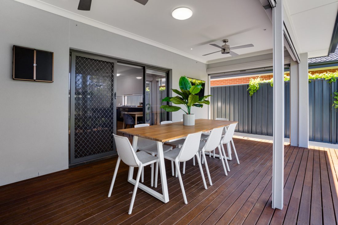 – Decked outdoor living space with alfresco blinds and ceiling fans