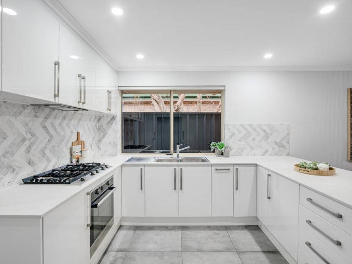 Continuing through the home, you’ll find a central living area that serves as an inviting space for gatherings and spending quality time with loved ones. Sliding glass doors connect the interior to the side exterior, welcoming sunlight and fresh air into the space. Effortlessly connecting from the living area is the modern kitchen, where sleek finishes, stone countertops, and a stylish herringbone splash back combine to create a beautiful, light and airy space. Complete with modern stainless-steel appliances, including a gas cooktop, and ample storage, this culinary haven is designed to inspire your inner chef.