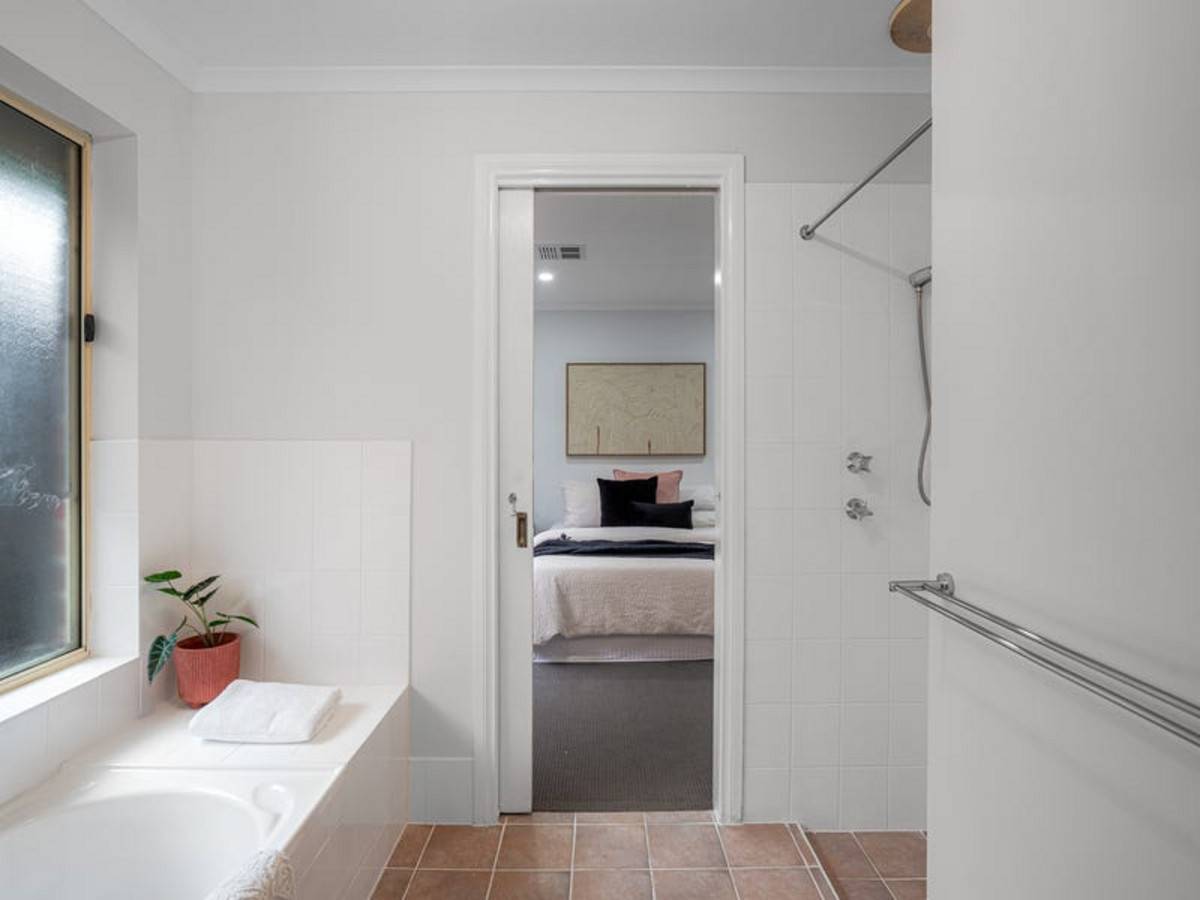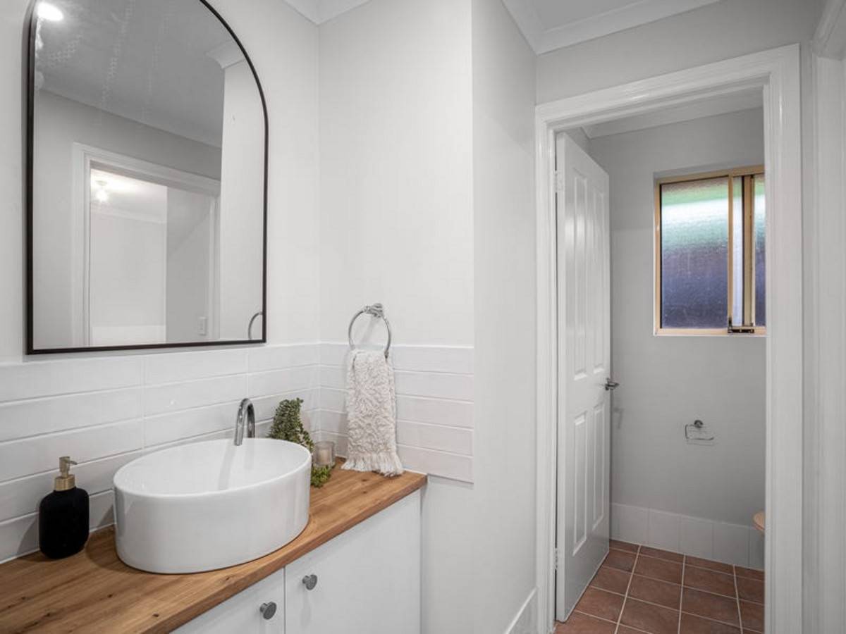 The main bathroom offers a luxurious retreat with its built-in bath, spacious shower, and separate toilet for added convenience. The stylish vanity, featuring a vessel sink and wooden bench-top, beautifully complements the warm Mediterranean-inspired floor tiles.