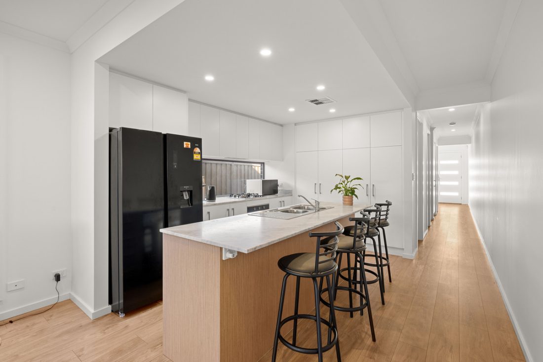 Step through the front door and you’re welcomed by a light-filled interior where crisp white walls, wood-look flooring and LED lighting create a bright, cohesive feel. Ducted air conditioning keeps things comfortable year-round, while the thoughtful layout makes daily living feel effortless.