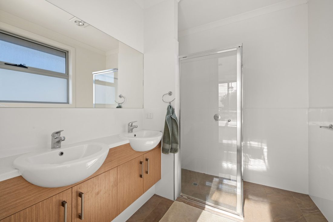 Upstairs, three carpeted bedrooms provide comfortable accommodation. Positioned at the front, the master suite feels like a private retreat, complete with built-in robe, ensuite featuring dual basins and shower, and its own balcony for a quiet morning coffee. The remaining two bedrooms also include built-in robes and are serviced by a central bathroom with bath, shower and a generous vanity area.