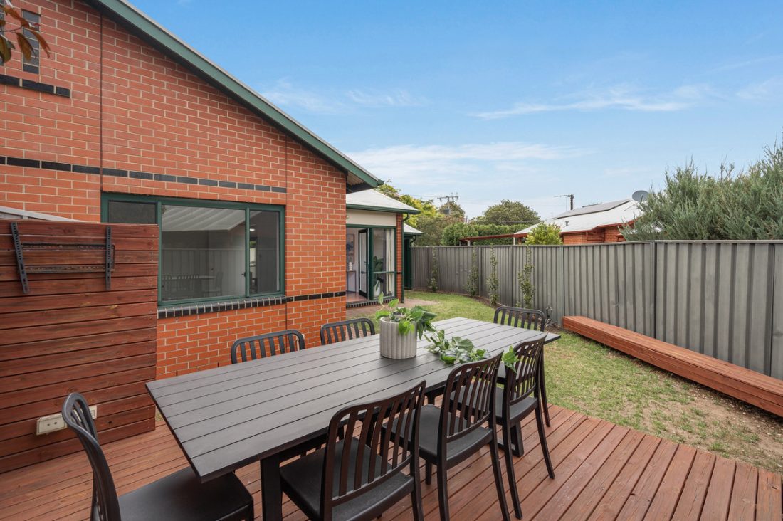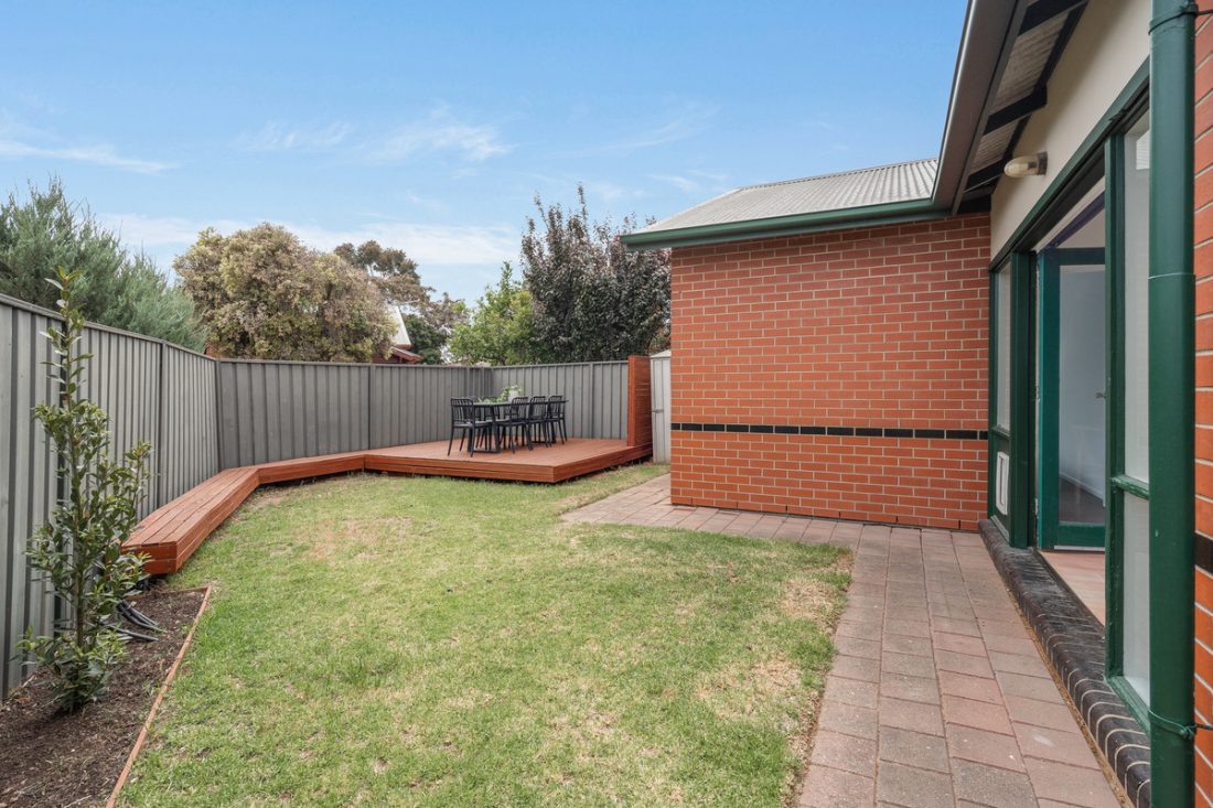 Beyond the French doors, you’ll discover a peaceful outdoor oasis. The lush lawn and stylish decking create the perfect space for soaking up the sunshine or entertaining friends and family in your private retreat.