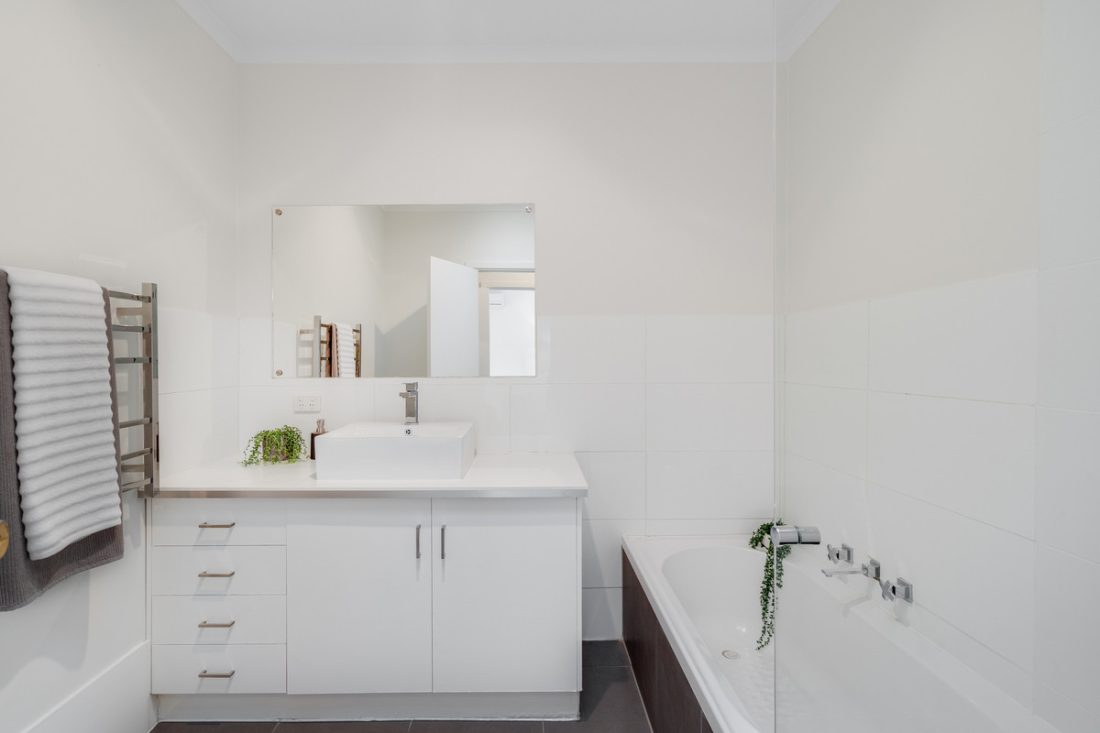 – Renovated bathroom with modern vanity, built-in bath and shower