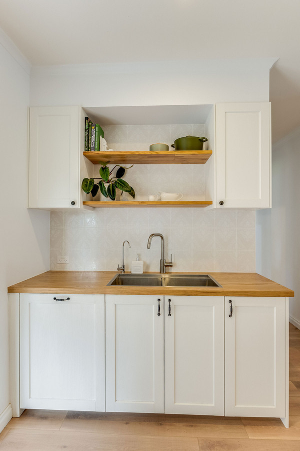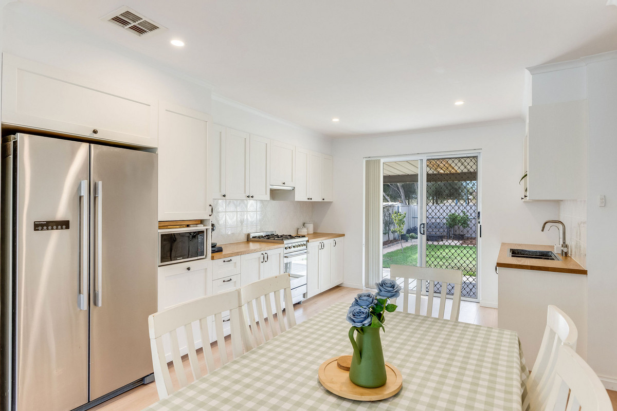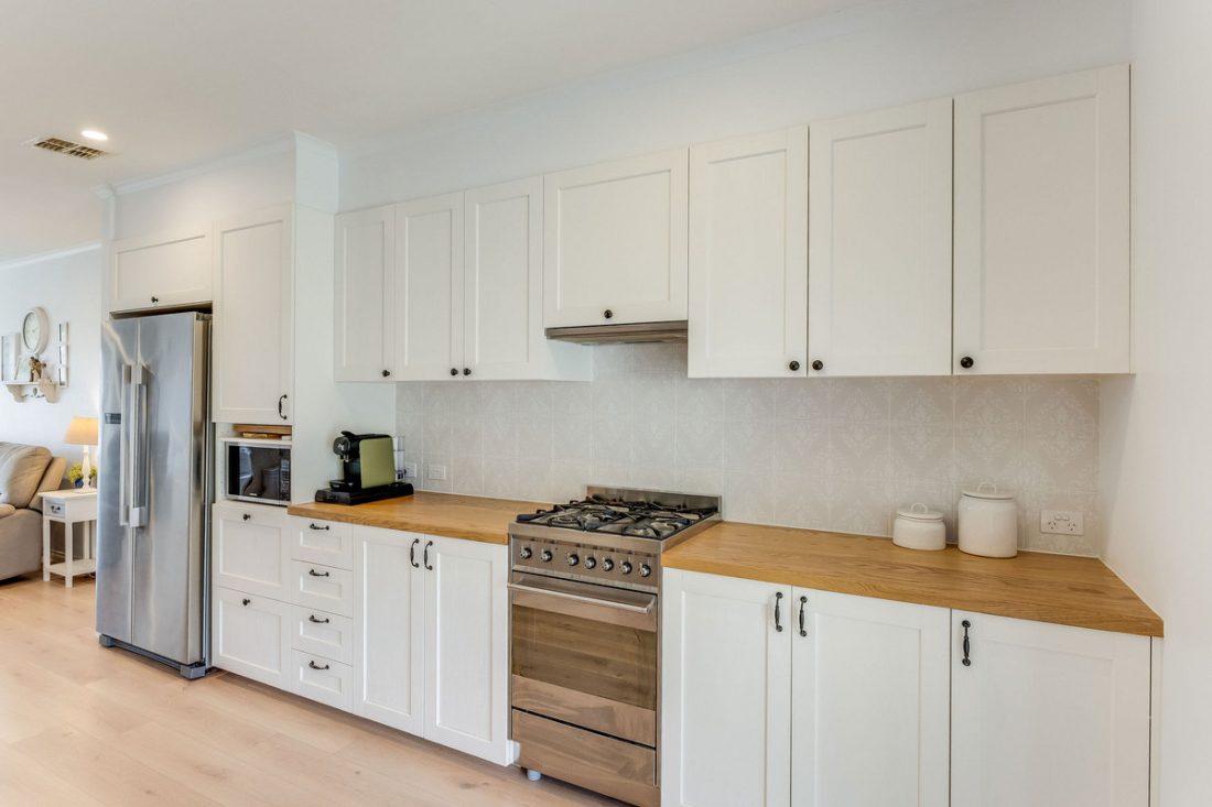 Step inside to fresh white walls and timber-look flooring flowing through the open-plan living, dining, and kitchen zone—a space designed for relaxed everyday living. The sleek kitchen delivers on both style and functionality, featuring white cabinetry, timber-look benchtops, stainless steel appliances, gas stovetop, tiled splashback, double sink, and room for your double-door fridge.