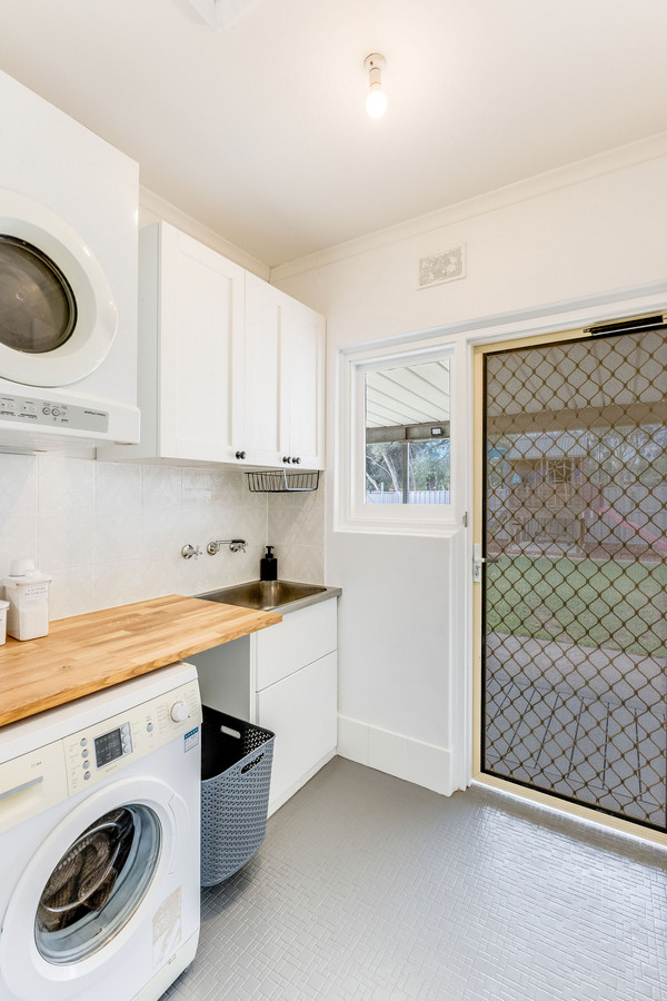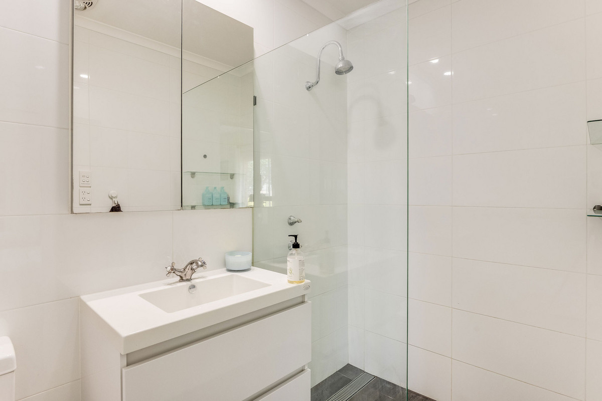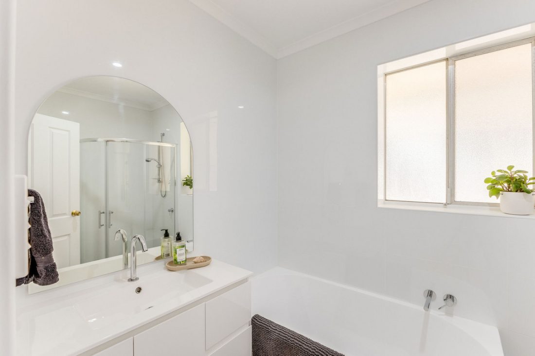 The main bathroom carries the same contemporary aesthetic, offering a built-in bath, large vanity, and a separate toilet for added convenience. A spacious, well-designed laundry adds practicality to match the style.