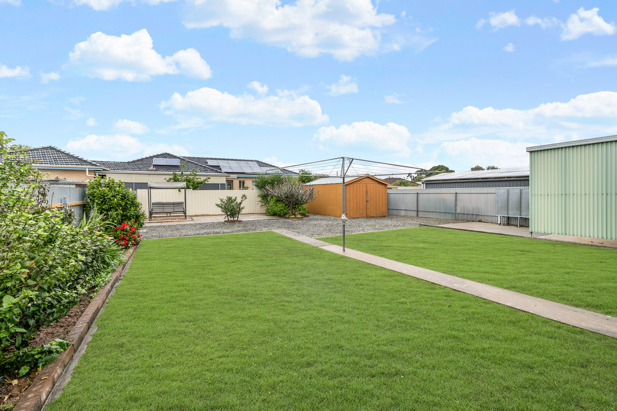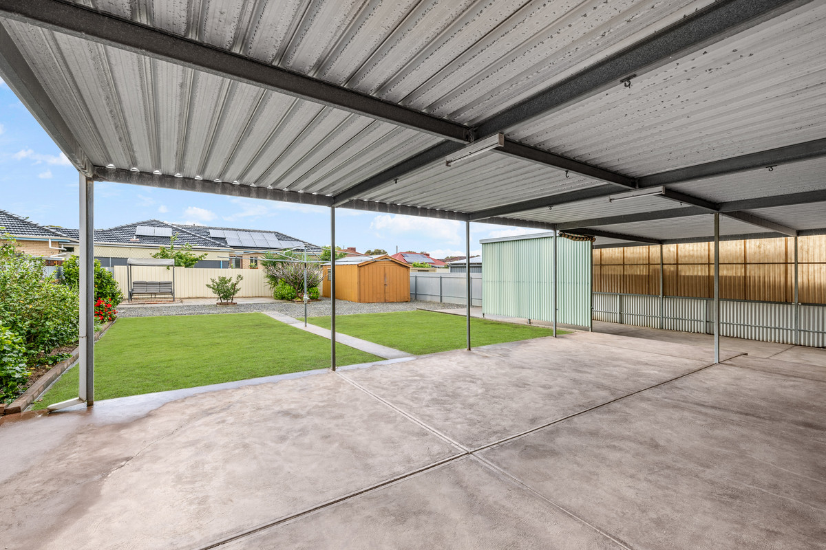 Outside, an expansive undercover entertaining area runs along the rear of the home, ideal for all-weather gatherings overlooking a lush lawn and central clothesline. A gravelled section provides flexibility for extra use, while the side-access carport and rear garage cater for up to three vehicles.