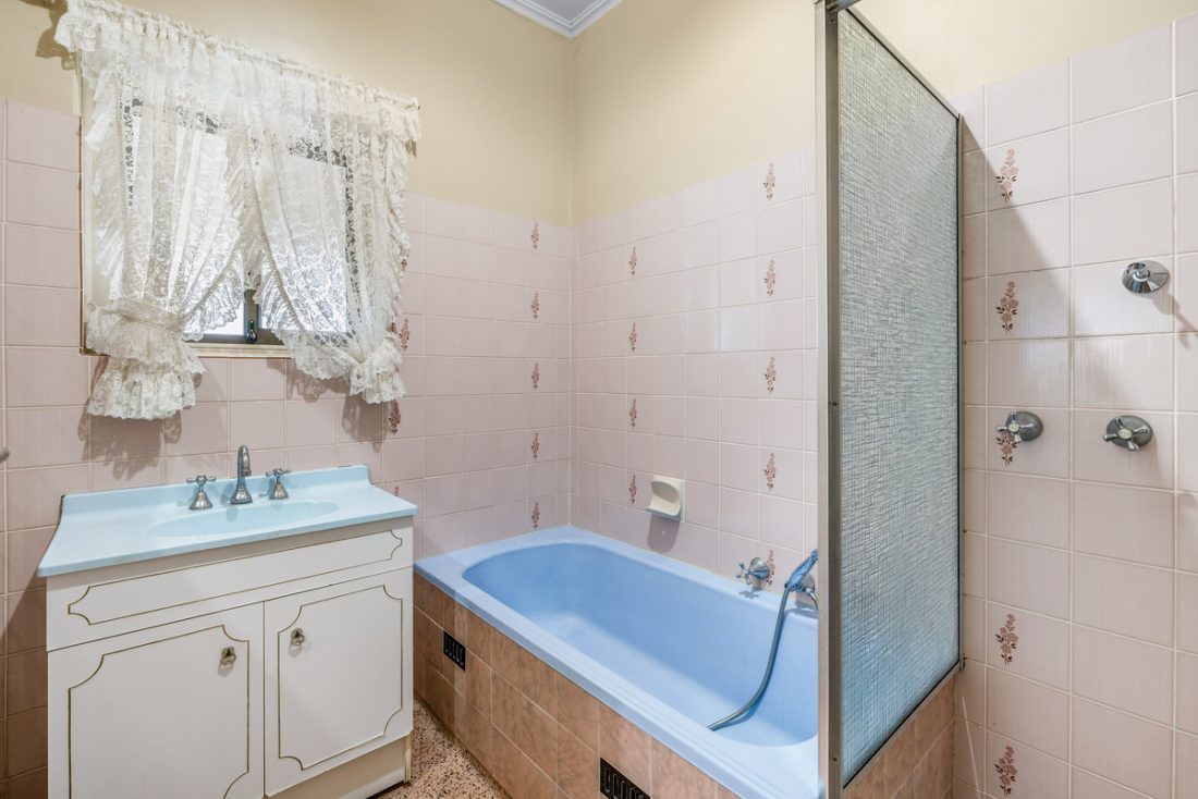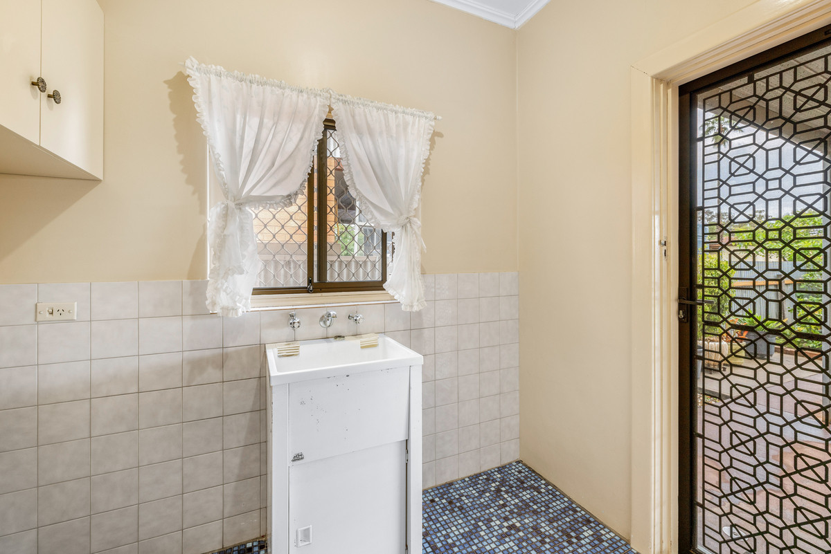 The original bathroom nods to its 1960s heritage with half-tiled walls, a built-in bath, shower, and vanity—timeless and full of character. A separate toilet adds convenience, while the adjoining laundry, accessed through a separate wash closet, opens directly to the outdoors.
