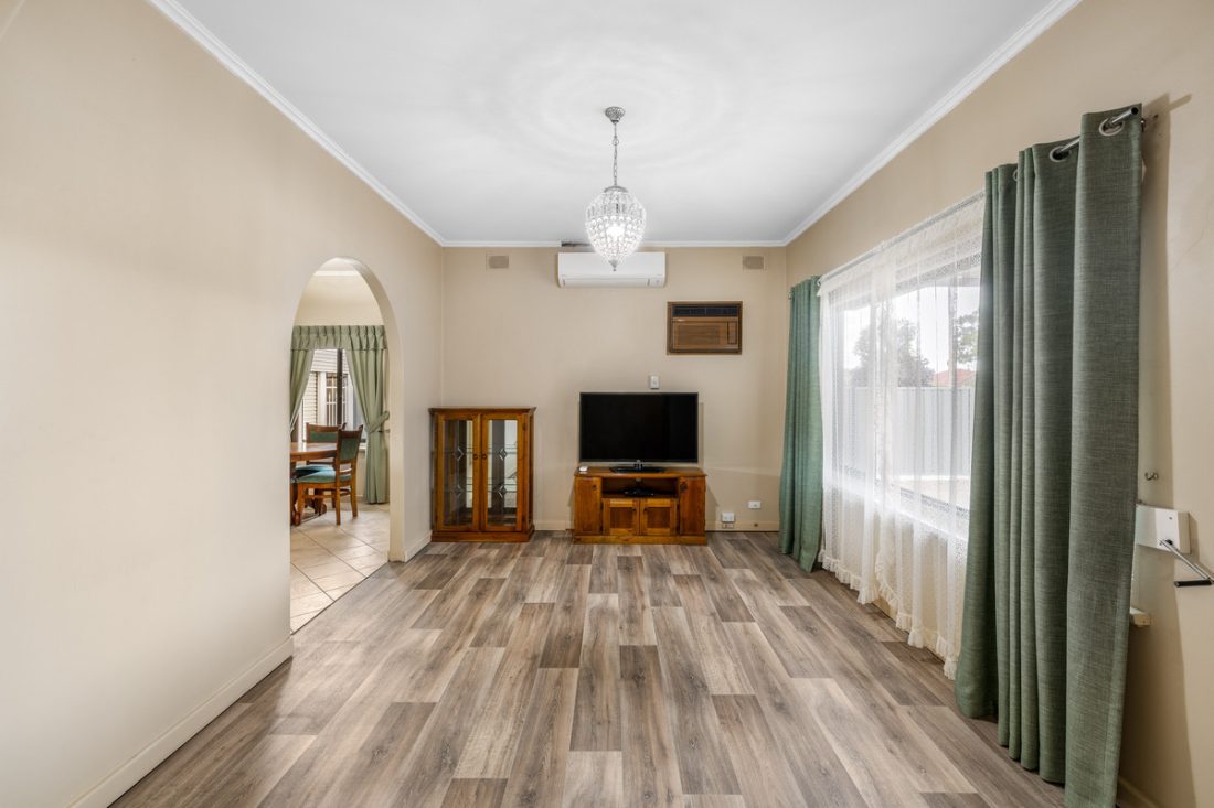 Inside, a light-filled front lounge welcomes you with its oversized picture window and split-system air conditioner, creating the perfect spot to unwind. An arched doorway leads through to the open kitchen and dining area, offering effortless connection between living zones.