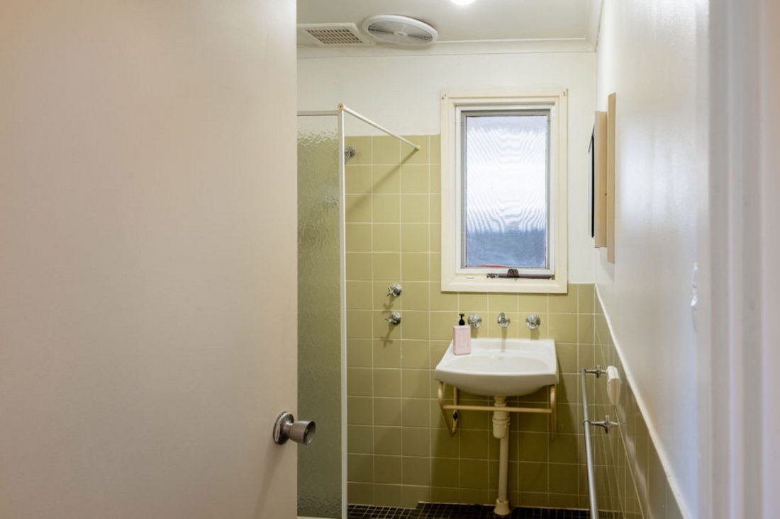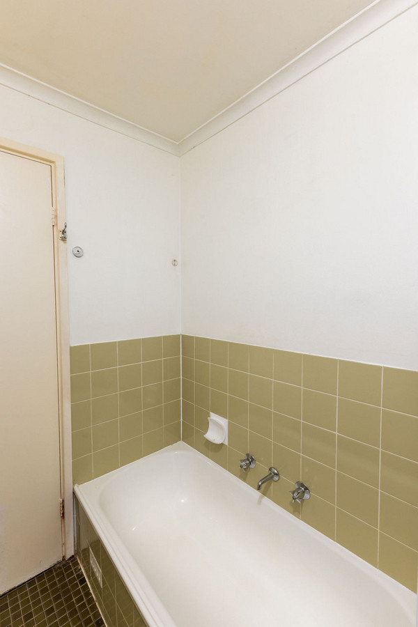 The well-maintained bathroom features a retro vibe with its green tiling and classic fixtures, while a separate toilet adds convenience to the floor plan.