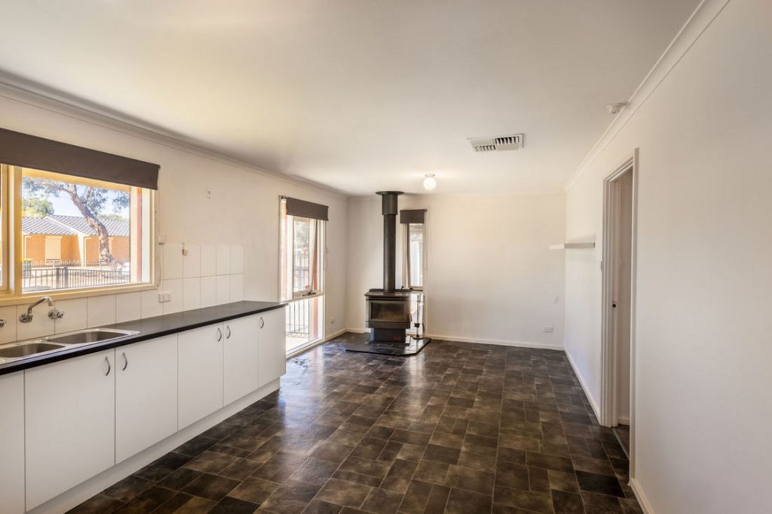 Inside, the open-plan kitchen and meals area is equipped with updated cabinetry, a double sink, and a freestanding oven with a gas cooktop. A charming heater adds both warmth and character to the space.