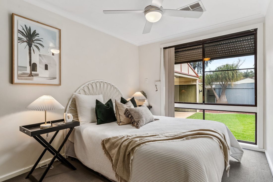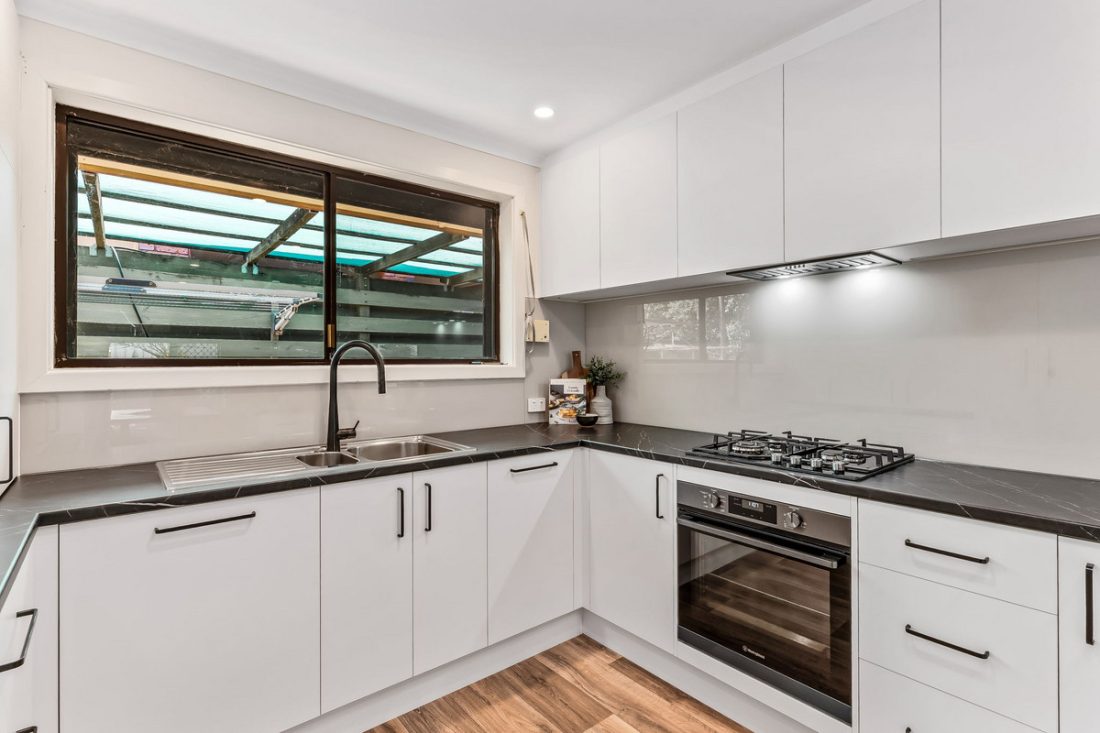 Step inside to a warmly inviting front lounge, complete with soft carpet underfoot, a ceiling fan for year-round comfort, and a large picture window that pours natural light through the space. At the heart of the home, the open-plan kitchen and meals area brings everyday living and entertaining together with ease. Wood-look flooring adds warmth underfoot, while sleek white cabinetry, black hardware, a breakfast bar and premium stainless-steel appliances including a gas cooktop create a stylish and functional kitchen.