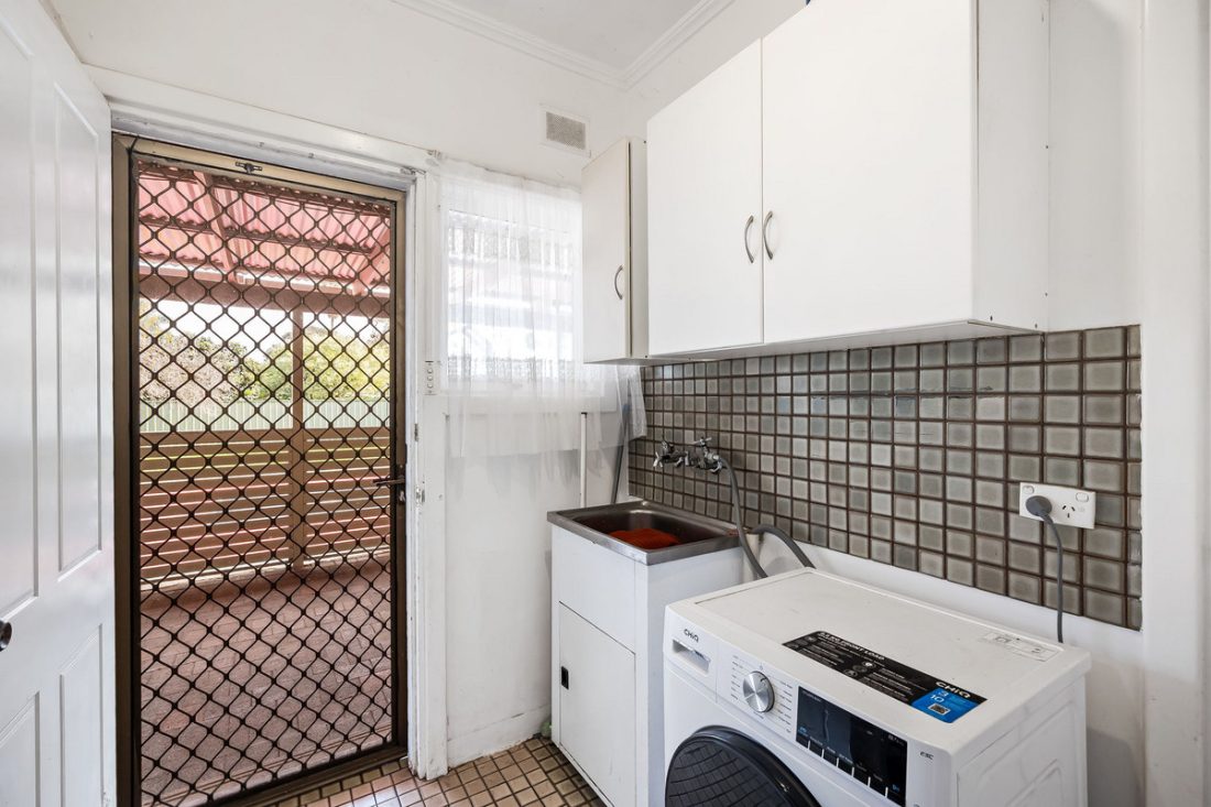 The bathroom is neatly presented with floor-to-ceiling tiles, vanity, and shower, while a separate toilet adds everyday convenience. A functional laundry with external access and built-in storage rounds out the essentials.